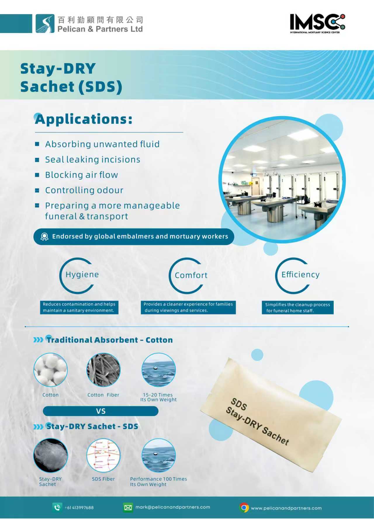 Represented by Mark Siu, PNP Australasia representative, IMSC’s cosmetic equipment, eco-pigments, portable embalming equipment and Stay-Dry sachet (Super Cotton) were being showcased at the expo the first time in Australia. All of the products above are designed to improve performance of mortuary and funeral operators, providing a modern, safe, clean and more-manageable solutions for professionals.